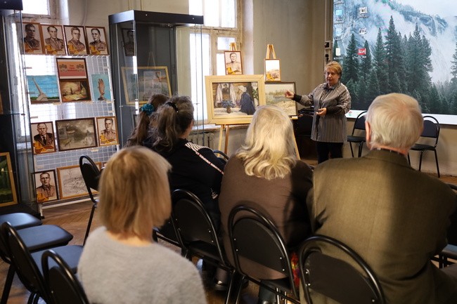 Сотрудник музея познакомила гостей с картинами, на полотнах которых изображены моменты страшного ночного сражения за центр Михайлова. Зрители увидели суровую зиму, разрушенные дома, портреты героев – освобождавших город Михайлов, мост, танк.